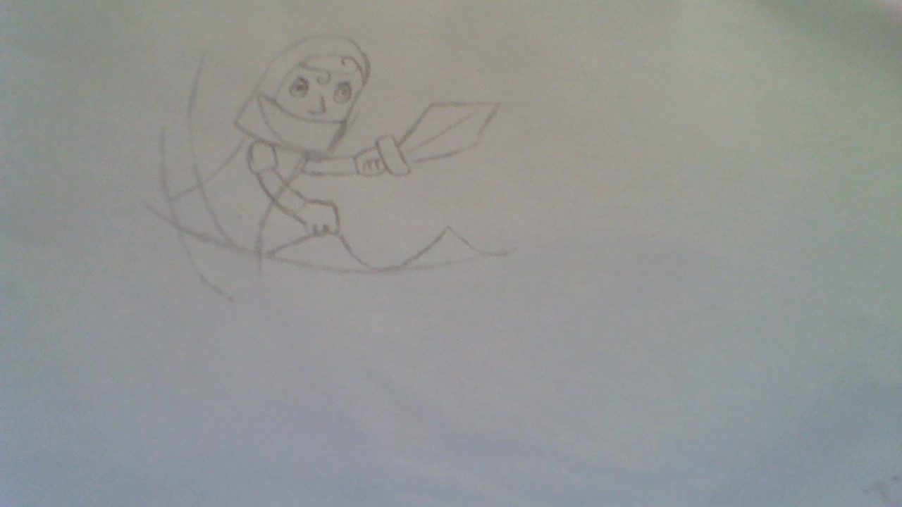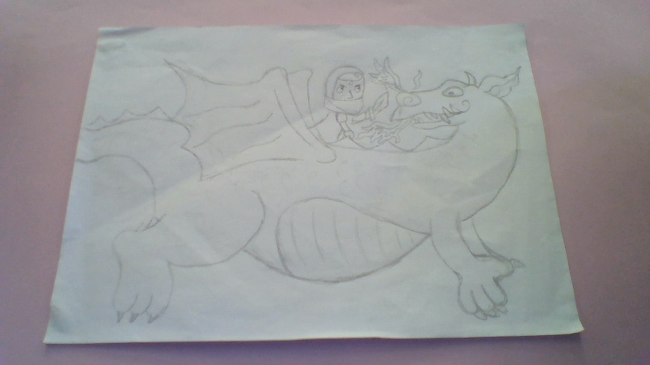 5. Draw the knight's body between the wings. Add a shape for the helmet, then draw the face. Draw the arms and add a sword too.