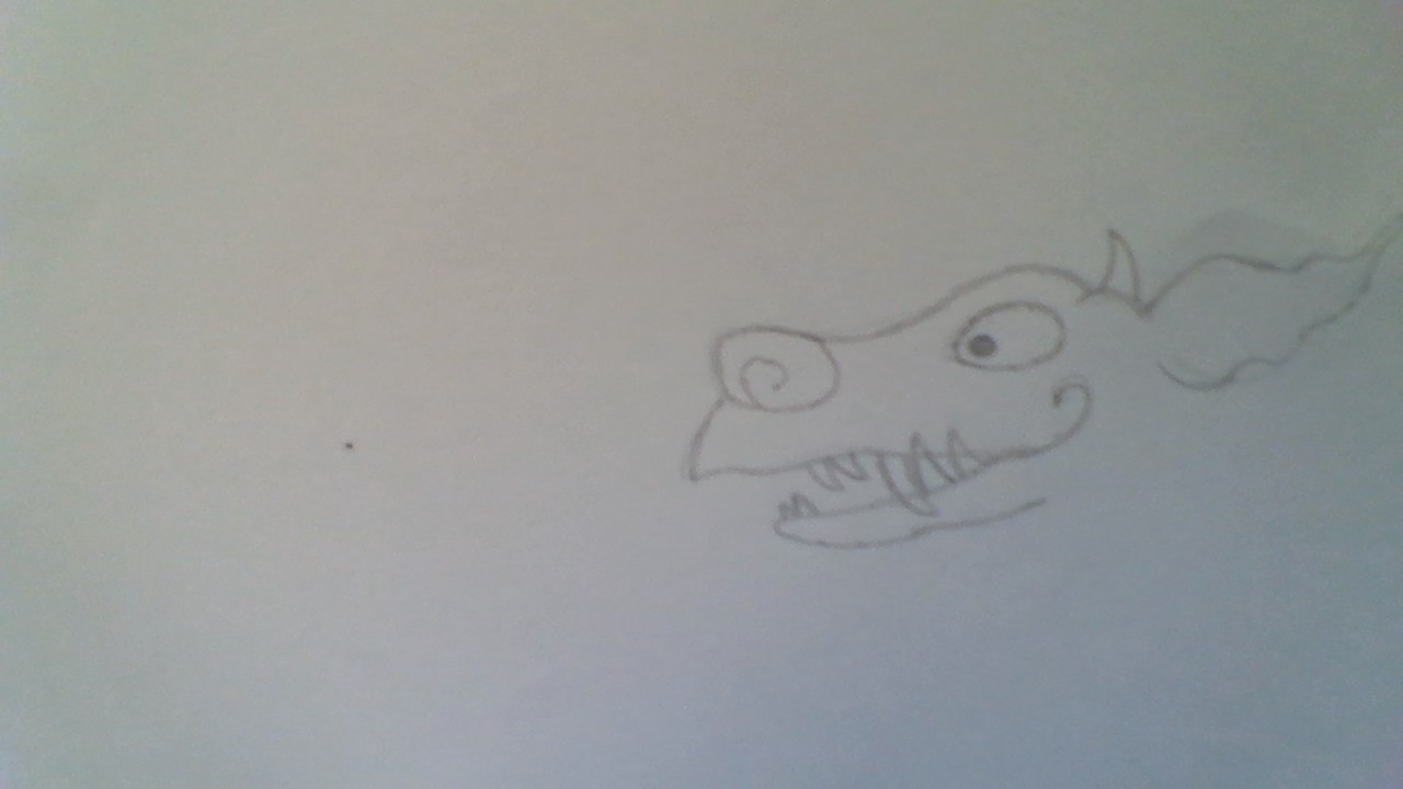 1. Start drawing on the right side of the page. Draw a spiral for the dragon's nostril, then draw the top of the head. Add an oval eye, a horn and an ear. Then draw the mouth with lots of teeth.