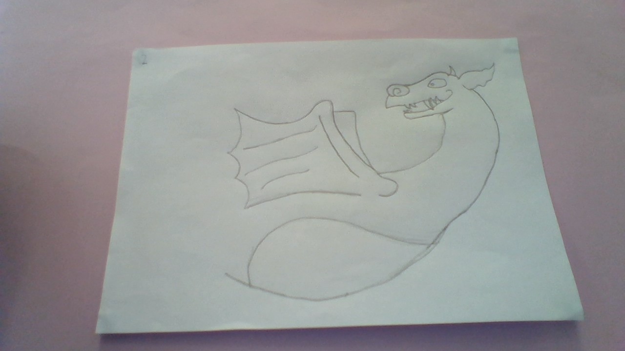 2. Add a curve for the dragon's back, then draw a big shape for the wing. Add another wing behind it. Then draw the tummy.