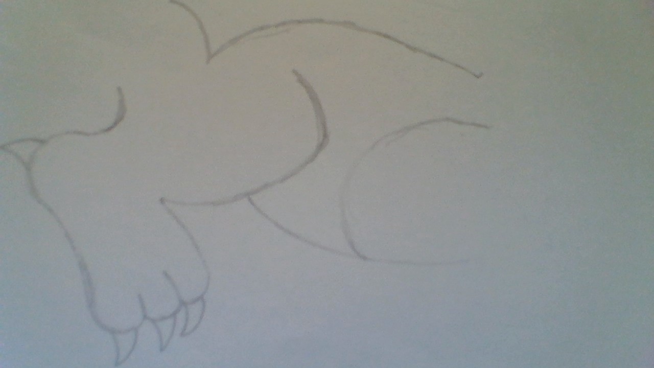 3. Draw curves for the back leg, and add a heel and three toes. Add claws on the toes and heel, then draw another leg behind the first one.